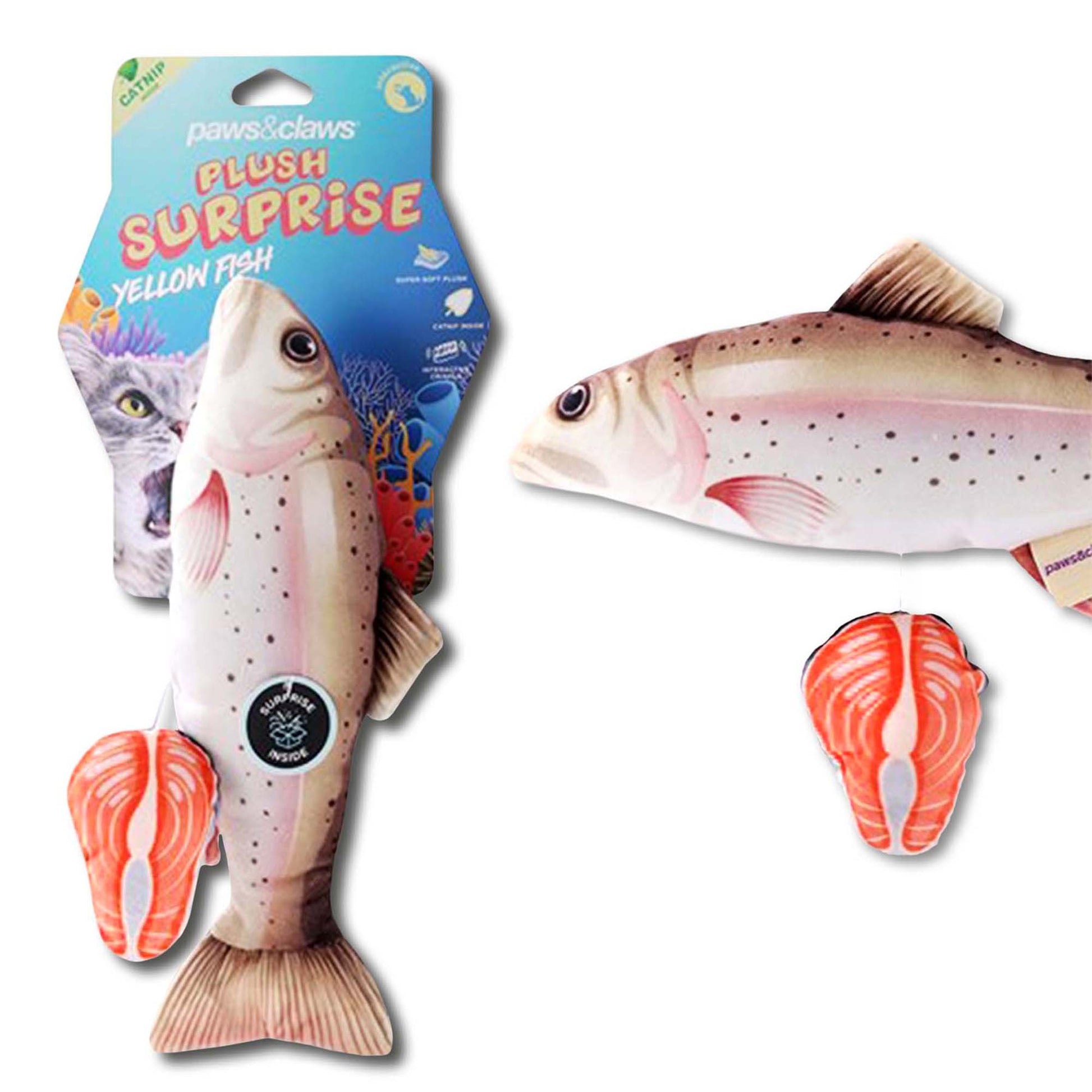 Our Paws & Claws Plush Fish Surprise will be your cat's new favourite toy! Our design features super soft plush, realistic print and interactive crinkle in the fins. Your cat will also discover a fishy surprise inside, that will surely keep them intrigued! Plus, catnip is included for extra excitement.